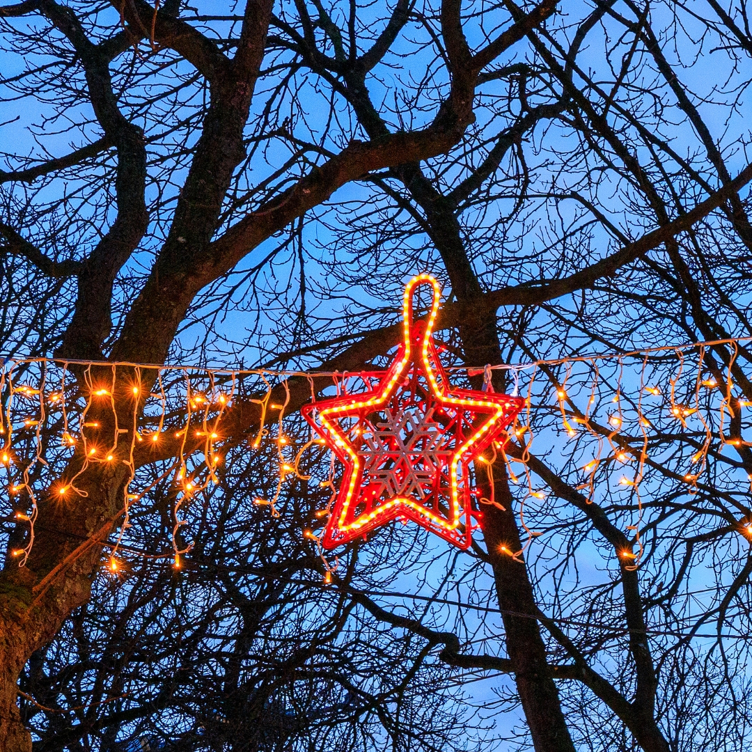 Alimentée en 230V – secteur, cette étoile suspendue s'installe facilement et offre un rendu lumineux constant et sûr. Parfaite pour créer une atmosphère festive et chaleureuse, elle devient rapidement un point focal lumineux qui séduit clients, visiteurs et passants.